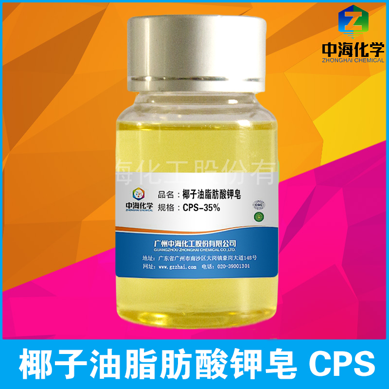 产品特性 ZHONGHAI CPS35天然植物油脂皂化,含有保湿成份,泡沫丰富,可用于洗面奶,沐浴露,洗涤产品中使用。含固量:30-35% PH值:8.5-10.5。色泽:淡黄色透明液体