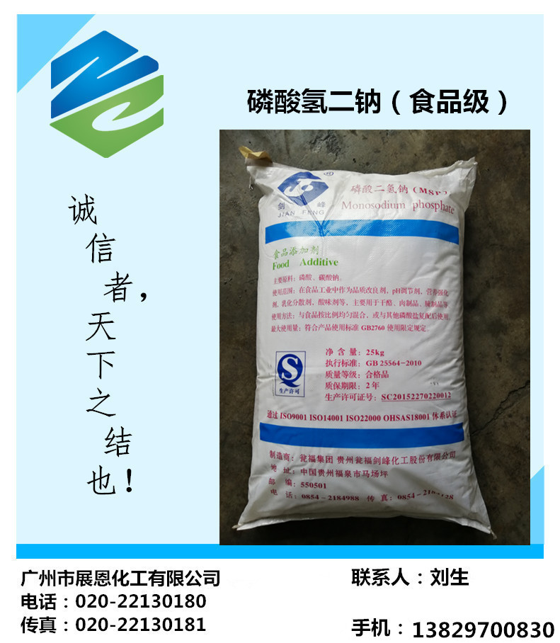 NaH2PO4·2H2O和NaH2PO4,相对分子质量为156.01和119.98。分无水物与二水物,二水物为无色至白色结晶或结晶性粉末,无水物为白色粉末或颗粒。易溶于水,几乎不溶于乙醇。100℃失去结晶水后继续加热,则生成酸性焦磷酸钠。