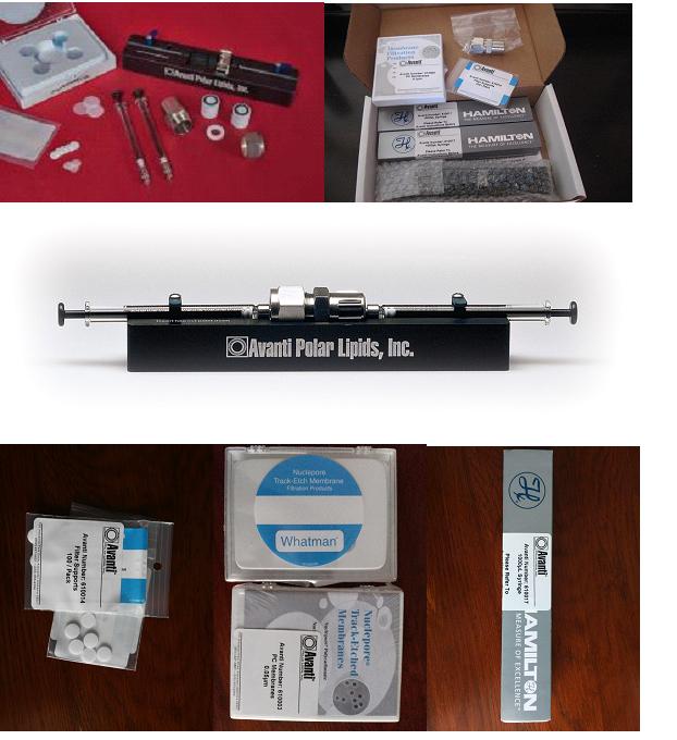 Avanti微型脂质体挤出器(套, 货号610000): 包含挤出器(extruder only), 2支1毫升进样器(2 syringes,1ml), 0.1微米聚碳酸酯膜100片(100 PC membranes,0.1 um),膜支撑100片(100 filter supports),和一个固定架(1 holder/heating block)
